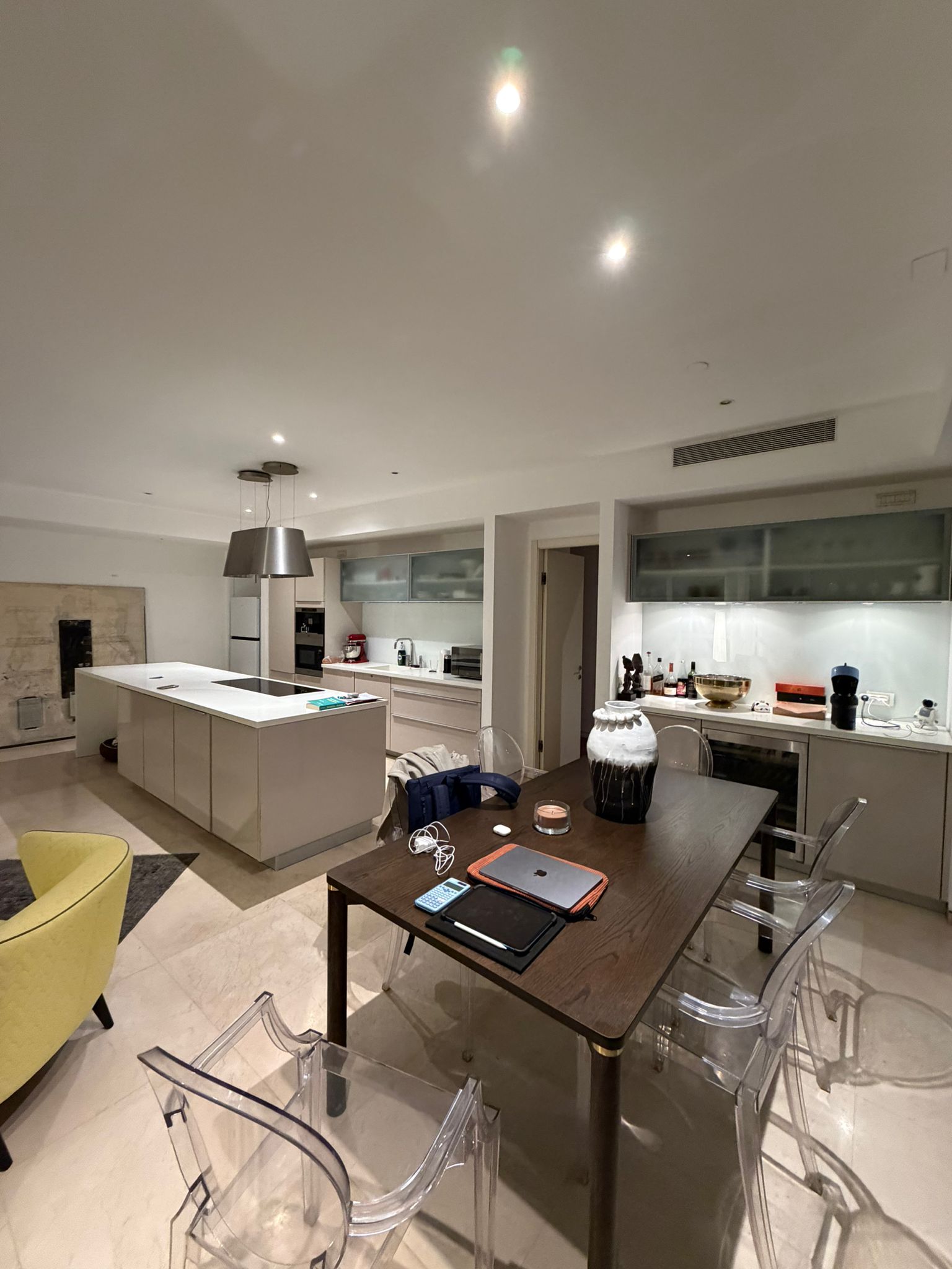 מטבח מרווח עם אי מאובזר במוצרי חשמל.